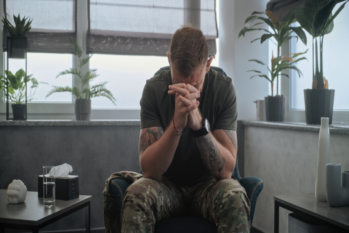 Adult in fatigues sitting in therapy office, overwhelmed — representing the impact of PTSD and the first step toward recovery.